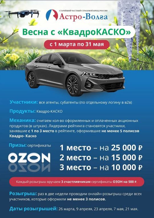 С 1 марта по 31 мая мы запускаем конкурс «Весна с Квадро-КАСКО». Чем больше полисов вы оформите, тем выше шанс выиграть ценные призы.